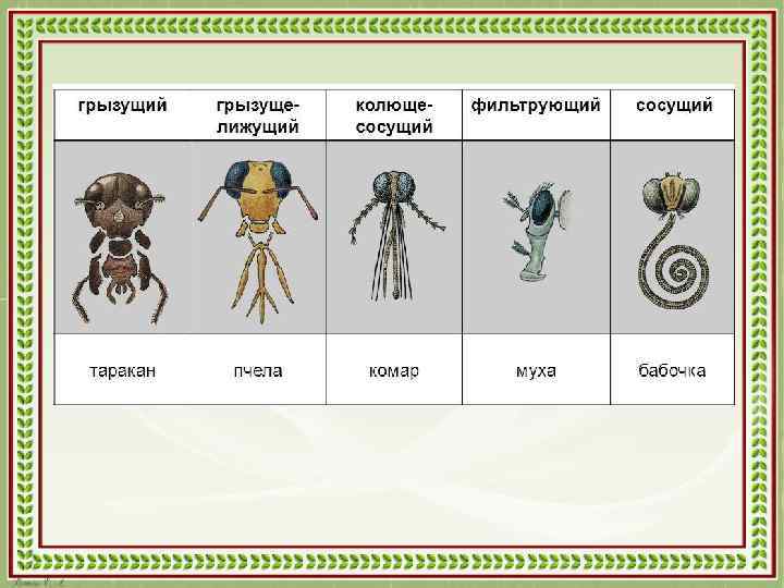 Лаборатория «Зоология беспозвоночных» (морфология и систематика) Задание 1. 1. Определите типы ротовых аппаратов насекомых. Приведите пример насекомого (одного), имеющего изображенный на рисунке ротовой аппарат. Данные занесите в таблицу. Тип ротового аппарата Пример насекомого 2. Назовите известные Вам отряды насекомых, для взрослых представителей которых характерны изображенные на рисунке типы ротовых аппаратов. Тип ротового аппарата Отряды насекомых •