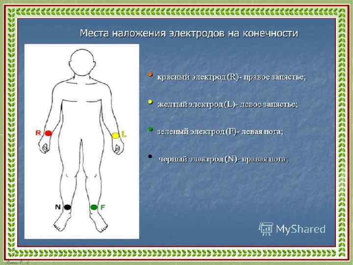 Лаборатория «Анатомия и физиология человека» Задание 1. Расшифровка кардиограммы Задание 2. Как прикрепляются электроды при измерении кардиограммы человека. «С красным флагом в правой руке, правой ногой на черной земле, левой ногой на зеленой траве, на левую руку луч желтый упал» . "Каждая Жена Злее Черта" - от правой руки по часовой стрелке - красный, желтый, зеленый, черный.