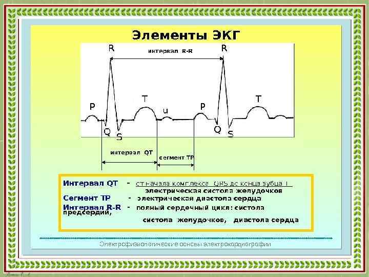 Электрокардиограмма P – отражает процессы сокращения и расслабления предсердий. Q, S – отражают процессы возбуждения межжелудочковой перегородки. R – процесс возбуждения желудочков. T – процесс расслабления желудочков. PQ – отражает время распространения импульса от предсердий до желудочков. QRST – длительность сокращения желудочков. ST – время полного возбуждения желудочков. TP – время электрической диастолы сердца.