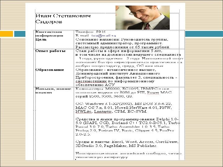 2. Резюме 12 Обязательно должно быть в резюме Основные и дополнительные навыки и интересы: Опытный пользователь ПК (Microsoft Word, Microsoft Excel, Visio, Credo, Robur). Знание языков программирования (Visual Basic, Pascal, C++). Наличие водительских прав. Знание иностранного языка – уровень выше среднего (разговорный, чтение, перевод).