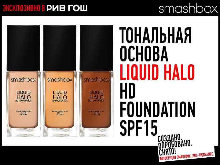КОРРЕКЦИЯ ТОНАЛЬНАЯ ОСНОВА LIQUID HALO HD FOUNDATION SPF 15 ДЕЙСТВИЕ • • • Прозрачная основа для среднего покрытия Естественное сияние Микроскопические пигменты, покрытые гелем, имитируют фотофильтры и скрывают изъяны ТОЛЬКО ФАКТЫ • • • Технология 100% жидкого света 10 оттенков Стойкая Увлажняющая Выдерживает жару и влагу Не содержит масел Разработано. Испытано. Снято. В SMASHBOX STUDIOS (ЛОС-АНДЖЕЛЕС)