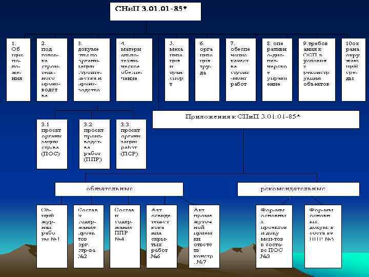 Структура СНи. П 3. 01 – 85* • 1. Запрещается осуществление строительномонтажных работ без утвержденных проекта организации строительства и проекта производства работ. • 2. Проект организации строительства является обязательным документом для заказчика, подрядных организаций, а также организаций, осуществляющих финансирование и материально-техническое обеспечение строительства. • 3. Проект организации строительства должен разрабатывать генеральная проектная организация или по ее заказу специализированная проектная организация • 4. Состав и содержание проектов организации строительства и формы основных проектных документов должны соответствовать приложениям