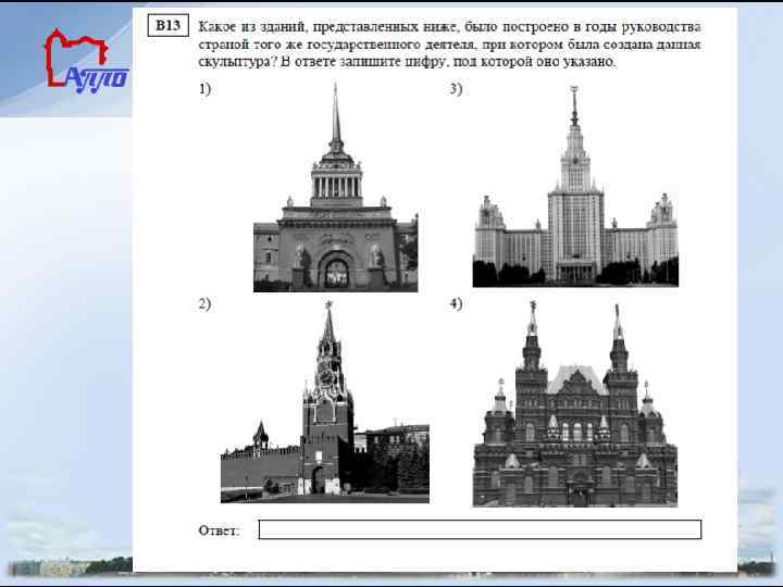 В 13. Какой из объектов культуры, представленных ниже, был создан в тот же период, что и данный? 1 2 3 4