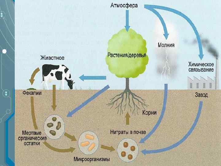 Азот в природе • В свободном виде в воздухе (~ 78%) • В виде нитратов в почве • Входит в состав белков