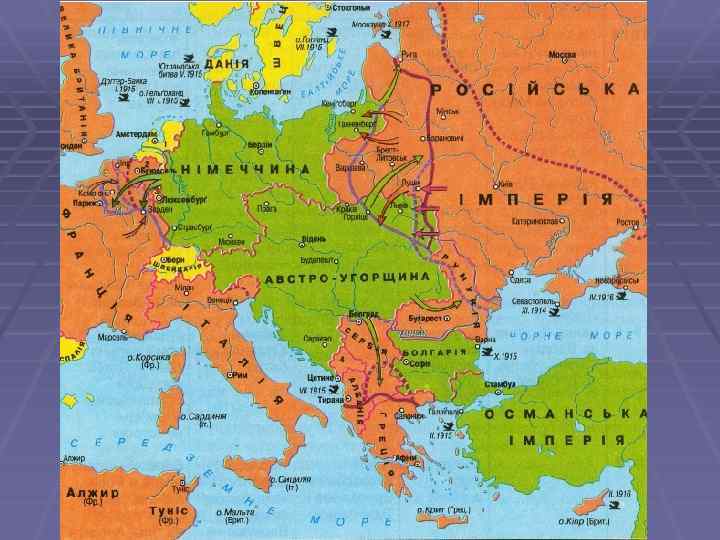 Воєнні дії на Західному фронті. 1917 рік. § Квітень 1917 р – наступ англо § § – французьких військ в районі Реймса – «бійня Невіла» ; Липень 1917 р. – наступ і поразка російських військ в Галичині; Жовтень 1917 р. – катастрофічна поразка італійських військ під Капоретто; Листопад – грудень 1917 р. – масове застовування англійцями танків в районі Камбре; Листопад 1917 р. – утворення Вищої воєнної ради країн Антанти. Розгром італійської армії під Капоретто