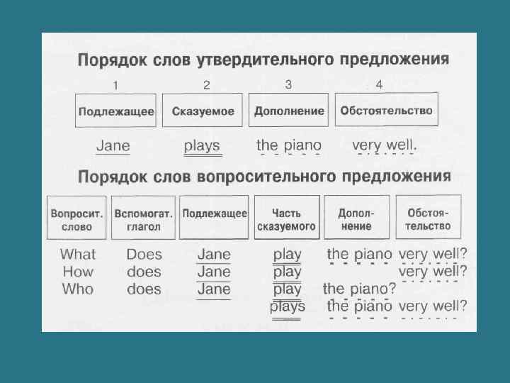 Подлежащее + сказуемое + прямое дополнение В обычном утвердительном предложении подлежащее ставится непосредственно перед сказуемым (глаголом). Прямое дополнение, когда оно есть, идет сразу после глагола. Например: They bought a car. — Они купили машину. We can’t do that. — Мы не можем этого сделать. The girl in a blue dress was playing the piano. — Девочка в синем платье играла на фортепиано.