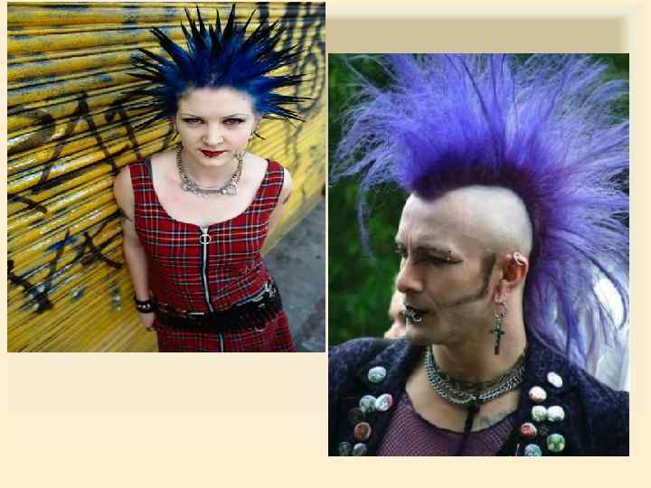 Внешний вид панков Многие панки красят волосы в яркие неестественные цвета, начёсывают и фиксируют их лаком, гелем или пивом, чтобы они стояли торчком. В 80 -х у панков стала модной причёска «ирокез» . Панки отличаются пёстрым эпатажным имиджем.