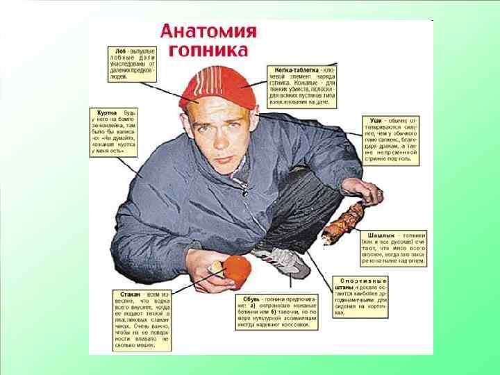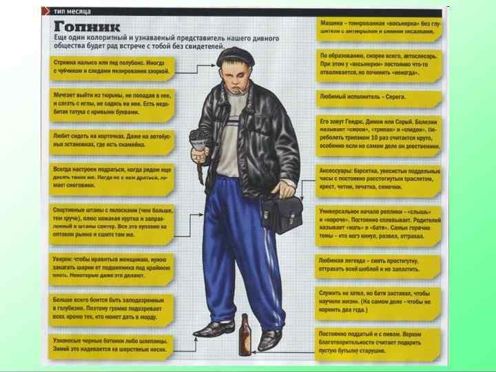 Отличительные черты Гопников характеризует развязная ( «борцовская» или раскачивающаяся) походка и агрессивная манера поведения: разглядывание прохожих в упор, фамильярное обращение, провоцирование на конфликты (например, «Ты чё такой дерзкий? » , Чё смотришь!? ), вымогание денег (например, «Слышь, мелочи не найдётся? » ) и других ценностей у прохожих; Гопники большую часть времени проводят на улице: среди излюбленных мест парки, скверы, старые дворы, автобусные остановки, гаражи (особенно если там проходит тропа от остановки общественного транспорта до жилых многоэтажек), дворики при детских садах; Распространена привычка сидения на корточках;