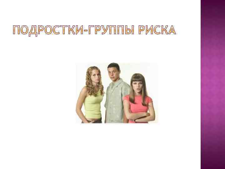• депрессивные подростки, • подростки, злоупотребляющие алкоголем и наркотиками, • подростки, которые либо совершали суицидальную попытку, либо были свидетелями того, как совершил суицид кто-то из членов семьи, • одаренные подростки, • подростки с плохой успеваемостью в школе, • беременные девочки, • подростки, жертвы насилия.