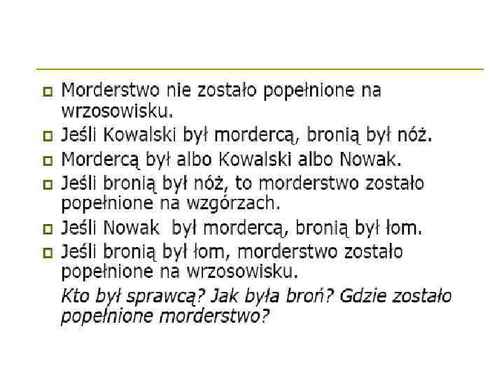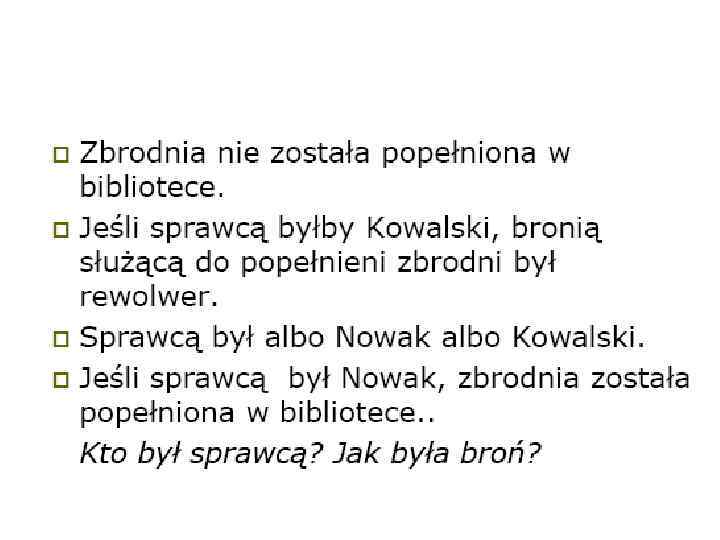 Z jakich prawdziwych powszechnie uznanych zdań można wywnioskować poniższe zdania: • Ołów jest cięższy od drewna. (ołów nie pływa po wodzie, drewno pływa po wodzie) • Kopernik nie był zakochany w Julii Roberts. (Kopernik zmarł w XVI w. Roberts urodziła się w XX w. ) • W 2000 roku żadna krowa nie odbyła lotu na Księżyc. (na pewno pisałyby o tym media, a nikt z nas nie słyszał takiej wiadomości) • Nil jest dłuższy od autostrady Katowice – Kraków. (Autostrada jest krótsza od Wisły, a Wisła jest krótsza od Nilu)