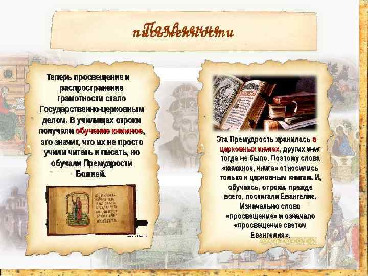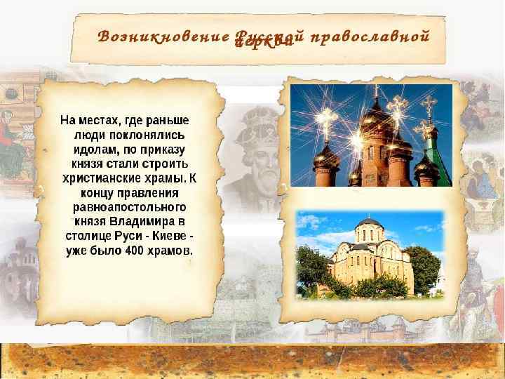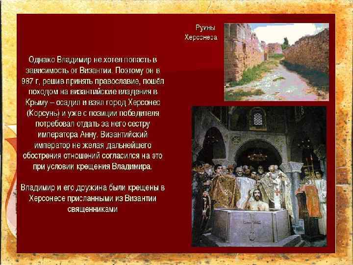 почему же Русь приняла христианство • ПРИЧИНЫ: 1. Начало междоусобных войн Святославичей, следовательно, стремление сплотить русский народ, чтобы сохранить государство; 2. Тесные торгово-экономические связи с Византией, установление дипломатических отношений с ней и династических браков. (862 год – Кирилл и Мефодий составили азбуку славянскую, кириллицу, и перевили на славянский язык богослужебные книги); • 3. Наличие христианства в соседних государствах; • 4. Личностный фактор, сила влияния князя Владимира.