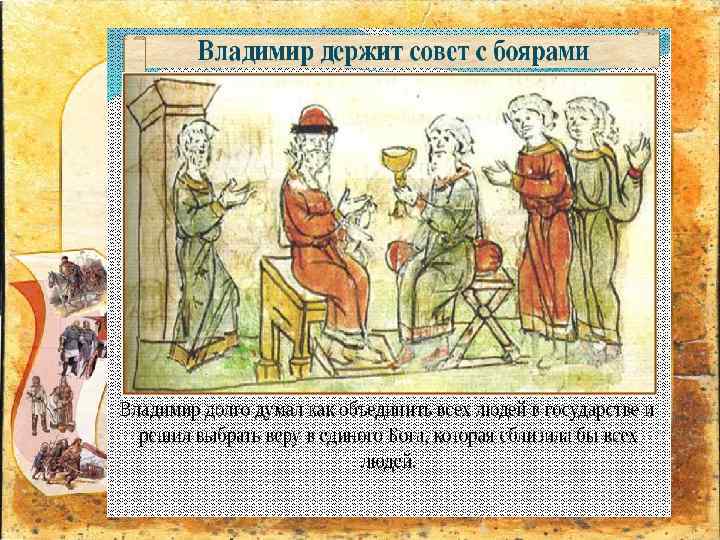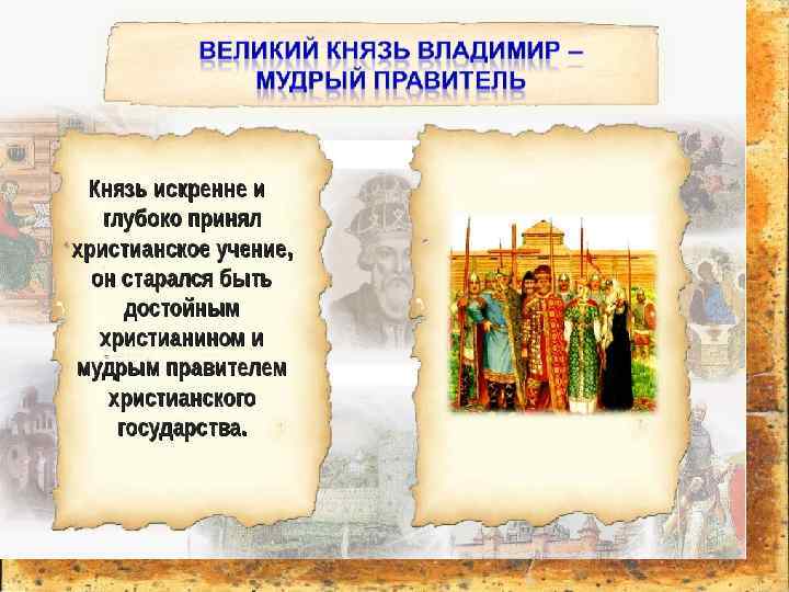 • Древние русские рукописи также характеризуют князя как добропорядочного христианина и мудрого правителя. Великий князь Владимир – мудрый правитель