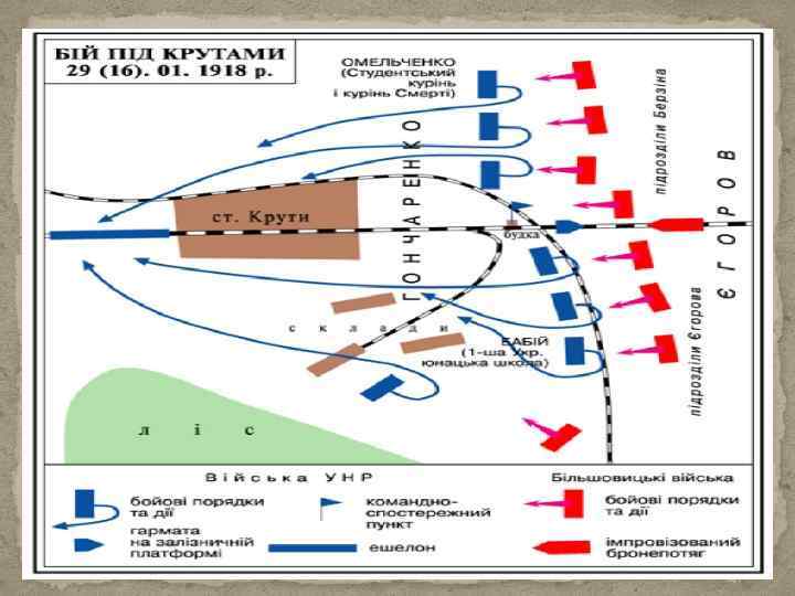 СЕРЕДИНА ГРУДНЯ 1917 РОКУ Перебував український гарнізон у складі чотирьох сотень (старших курсів) 1 -ї Київської юнацької (юнкерської) школи імені Богдана Хмельницького 26 СІЧНЯ 1918 РОКУ Прибуло підкріплення: перша сотня новоствореного Студентського куреня. Більшість студентів була без жодної військової підготовки та погано озброєна. На додаток, вже під час самого бою, приєдналося ще й 80 добровольців з підрозділів місцевого Вільного козацтва