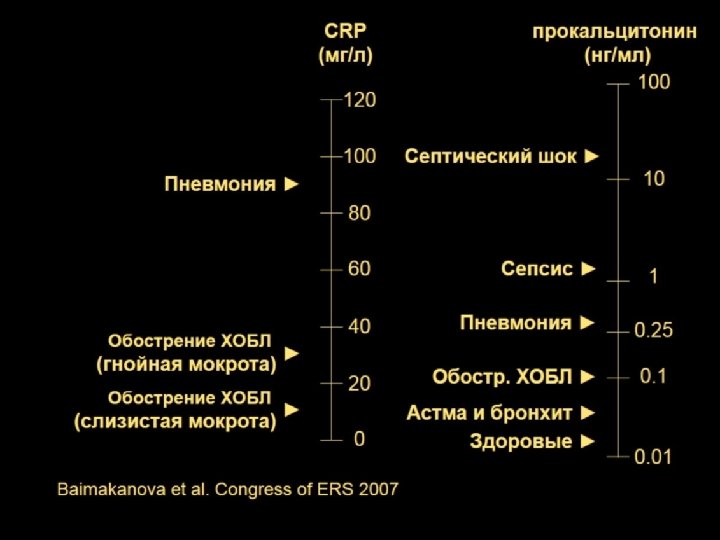 Шкала CRB-65* Симптомы и признаки: § § § Нарушение сознания (С) ЧД ≥ 30 в 1 минуту (R) Систолическое АД < 90 мм. рт. ст, Диастолическое АД ≤ 60 мм. рт. ст Возраст ≥ 65 лет (65) 0 баллов, летальность 1, 2% 1 -2 балла, летальность 8, 15% Амбулаторное лечение Лечение в стационаре (В) 3 -4 балла, летальность 31% Неотложная госпитализация в ОРИТ * - наличие каждого из признаков оценивается в 1 балл