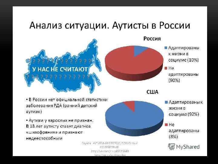 Число аутистов катастрофически растет во всем мире. В России же аутисты редко становятся полноценными членами общества. Как правило, диагностика аутизма в России проводится на относительно позднем этапе, когда многие возможности уже упущены. Большинство малышей-аутистов в нашей стране не ходят в детский сад и учатся в школах для умственно отсталых, тогда как во многих странах мира почти все дети с такими расстройствами посещают обычные сады и школы. Мировой опыт показывает, что при правильном подходе к аутистам эти люди способны быть первоклассными специалистами во многих профессиях, создавать семьи и служить в армии, но полноценными членами российского общества удается стать лишь немногим из них. С каждым годом аутистов становится больше. Детский невролог Минздрава Андрей Петрухин недавно назвал аутизм одной из самых распространенных детских болезней. По его словам, в России им страдает один ребенок из тысячи. Другие российские эксперты называют еще большие цифры. По словам психолога Марины Бардышевской, практически в каждой группе детского сада есть ребенок с аутистическим расстройством