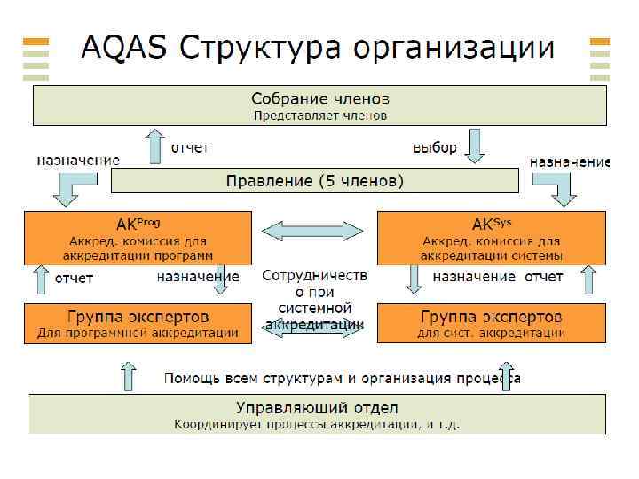 Пример (Германия) • Оба вида аккредитации проводятся через определенный промежуток времени – через пять или семь лет. • Агентства по аккредитации являются некоммерческими организациями. • Агентства не финансируются государством, а находятся на самофинансировании • Все агентства должны регулярно проходить аккредитацию Немецким советом по аккредитации