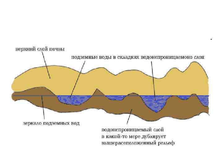 • Верховодка занимает ограниченные территории и в засушливое время года верховодка исчезает. • Верховодка относится к первому от поверхности земли водоупорному пласту. • Когда водоупорный пласт залегает вблизи поверхности или выходит на поверхность, в дождливые сезоны развивается заболачивание. •