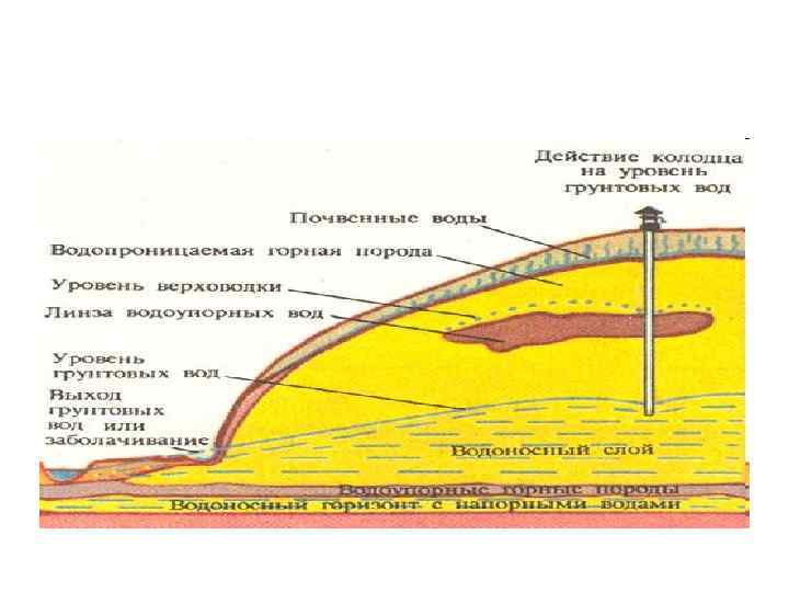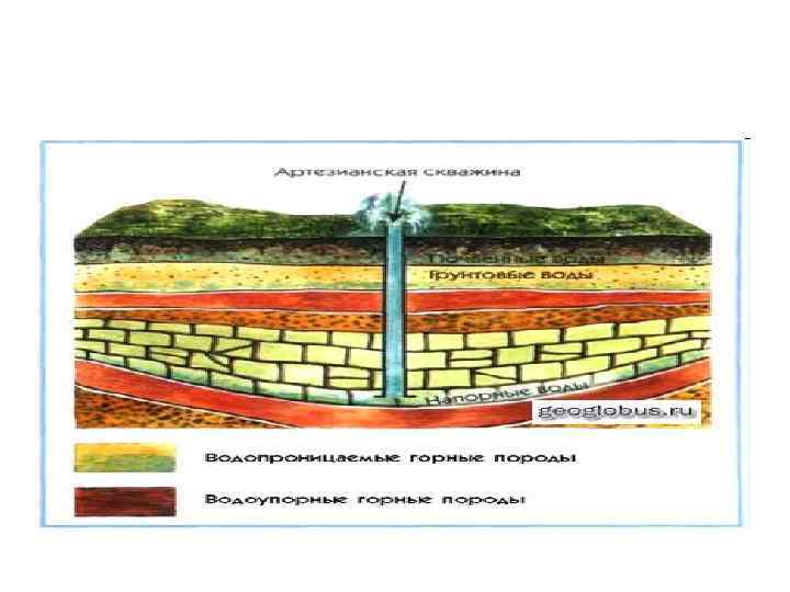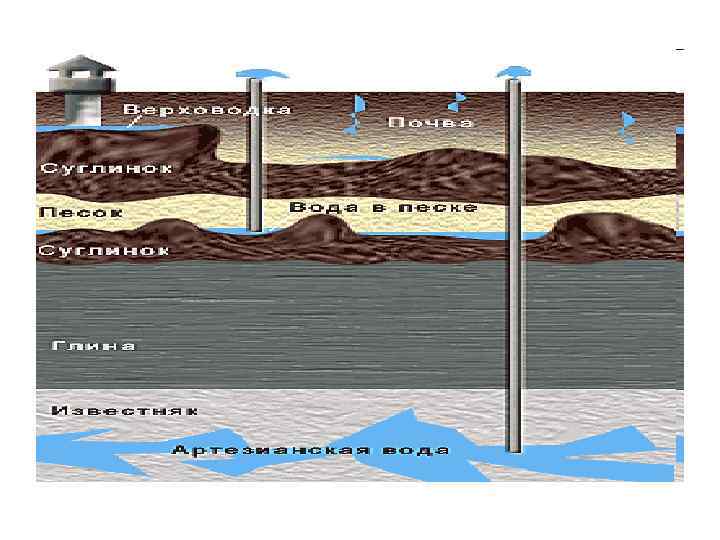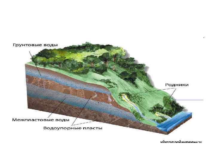 • Разновидность грунтовых вод — межпластовые воды. • Они отличаются от грунтовых наличием перекрывающего водоупорного пласта.
