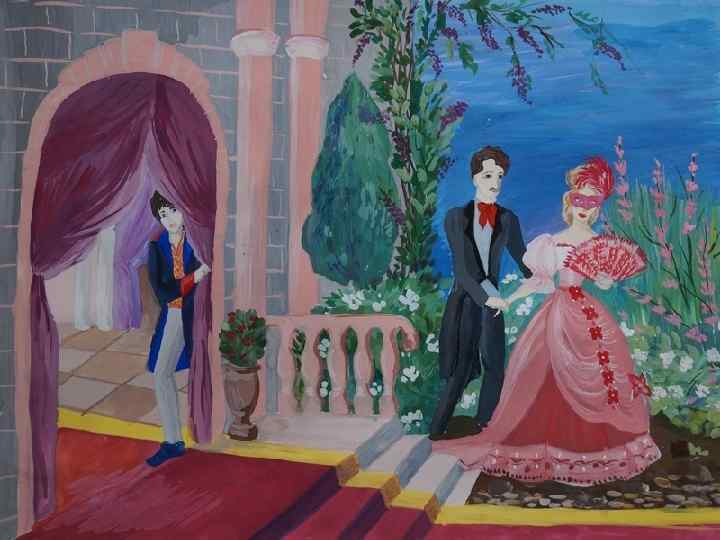 «Из – под таинственной , холодной полумаски Звучал мне голос твой отрадной , как мечта. Светили мне твои пленительные глазки И улыбалися лукавые уста. . »