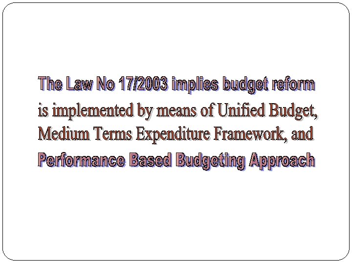LEGAL ASPECT OF THE BUDGET REFORM v The reform has now been underway. . . v The new laws and regulations on public finance, treasury, and planning which have been ratified and performed as legal basic for implementing new budget system include: • • • Law No 17 / 2003 on Public Finance Law No 1 / 2004 on Treasury Law No 15 / 2004 on Auditing of Public Finance Account Law No 25 / 2004 on National Development Planning Regulation No 20 / 2004 on Government Work Plan Regulation No 21 / 2004 on Line Ministry and Agency Budget Work Plan.