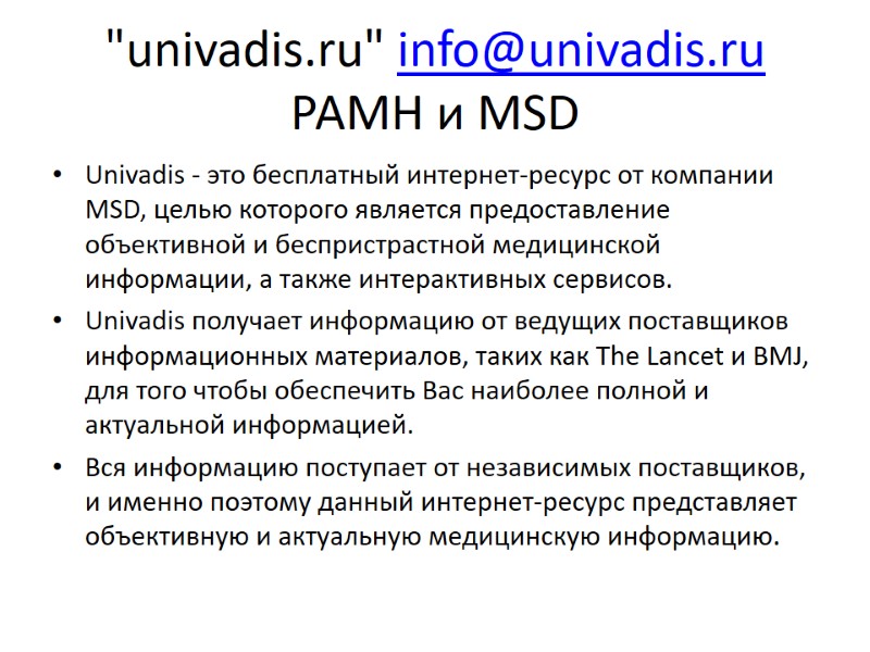 "univadis.ru" [email protected] РАМН и MSD Univadis - это бесплатный интернет-ресурс от компании MSD, целью которого является предоставление объективной и беспристрастной медицинской информации, а также интерактивных сервисов. Univadis получает информацию от ведущих поставщиков информационных материалов, таких как The Lancet и BMJ, для того чтобы обеспечить Вас наиболее полной и актуальной информацией. Вся информацию поступает от независимых поставщиков, и именно поэтому данный интернет-ресурс представляет объективную и актуальную медицинскую информацию.