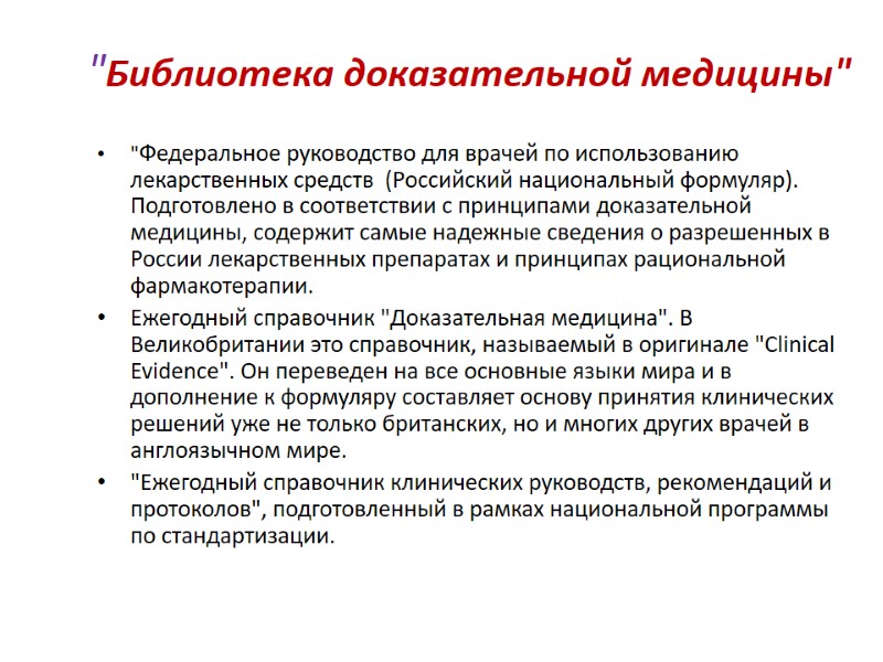 "Библиотека доказательной медицины" "Федеральное руководство для врачей по использованию лекарственных средств (Российский национальный формуляр). Подготовлено в соответствии с принципами доказательной медицины, содержит самые надежные сведения о разрешенных в России лекарственных препаратах и принципах рациональной фармакотерапии. Ежегодный справочник "Доказательная медицина". В Великобритании это справочник, называемый в оригинале "Clinical Evidence". Он переведен на все основные языки мира и в дополнение к формуляру составляет основу принятия клинических решений уже не только британских, но и многих других врачей в англоязычном мире. "Ежегодный справочник клинических руководств, рекомендаций и протоколов", подготовленный в рамках национальной программы по стандартизации.
