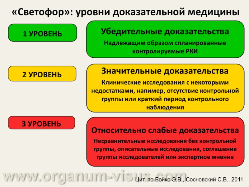 Уровни доказательности информации клинических рекомендаций I-а - доказательство на основе мета-анализа клинических рандомизированных контролируемых исследований (РКИ); I-b - доказательство на основе, по крайней мере, одного клинического РКИ; II-а - доказательство на основе, по крайней мере, одного хорошо спланированного контролируемого клинического исследования без рандомизации; II-b - доказательство на основе хотя бы одного хорошо спланированного квази-экспериментального исследования другого типа; III - доказательство на основе хорошо спланированного неэкспериментального описательного исследования, такого как сравнительное исследование, исследование корреляции и исследования «случай-контроль»; IV - доказательство на основе отчета экспертного комитета или точки зрения или клинического опыта уважаемых авторитетов (не основанных на критериях доказательной медицины).