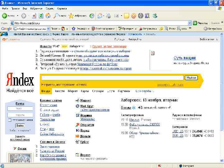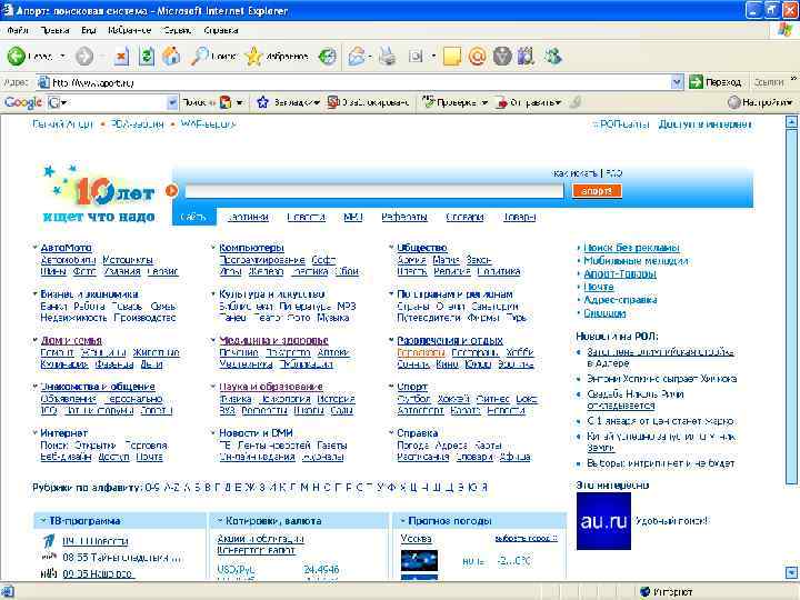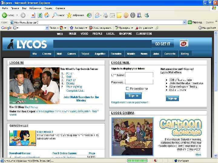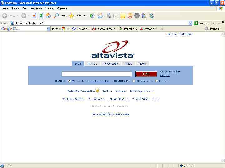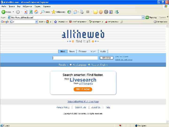 Популярными указателями являются: n 1. 2. 3. 4. Зарубежные Google – www. google. com Alta Vista – www. altavista. com Lycos – www. lycos. com Fast Search – www. alltheweb. com n 1. 2. 3. 4. Российские Яndex – www. yandex. ru Рамблер – www. rambler. ru Апорт – www. aport. ru Go. ru www. gogo. ru