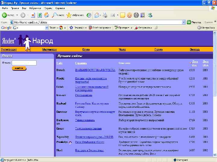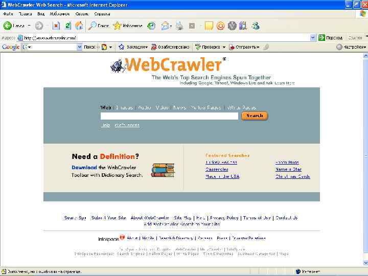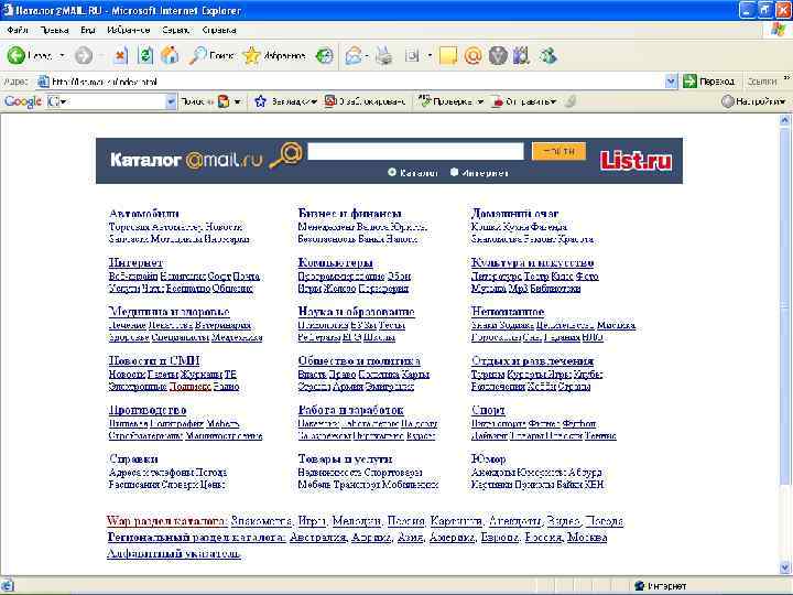 Примеры поисковых каталогов: n 1. 2. 3. Зарубежные n Российские Yahoo! – 1. List-Ru – www. yahoo. com www. list. ru Magellan – 2. Narod www. mckinley. com http: //narod. yandex. ru/rubrics/ Web. Crawler – www. webcrawler. com указатели