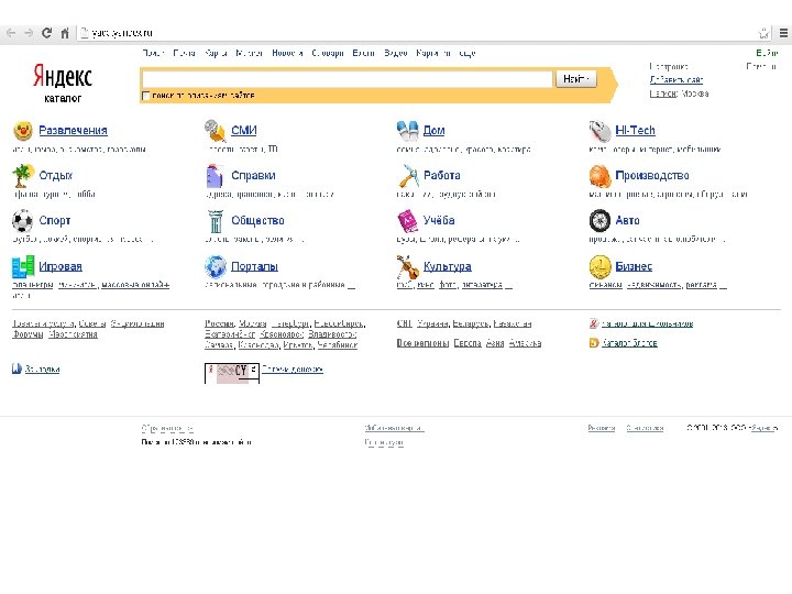 Информационные поисковые системы КАТАЛОГИ ПОИСКОВЫЕ МАШИНЫ Локальные www. city. ru www. yandex. ru www. list. ru www. rambler. ru www. atrus. ru www. aport. ru Глобальные www. lycos. com www. altavista. com www. yahoo. com www. google. com Каталоги – базы данных, которые заполняются вручную. (выдают меньшее число ссылок) Индексы – программы-роботы, которые постоянно обследуют Интернет и заполняют базы данных. (выдают много ссылок)
