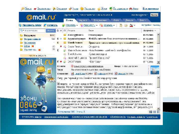 Проекты В 1998 году программисты, работающие в петербургском офисе американской софтверной компании Data. Art, создали новое программное обеспечение для почтового веб-сервера, которое в дальнейшем предполагалось продавать западным компаниям. Чтобы протестировать сервис, его временно выложили в открытый доступ для российских пользователей, а сервис вдруг стал стремительно набирать популярность. Ключевой сервис портала — почтовая служба @mail. ru — крупнейшая в России система электронной почты[источник не указан 473 дня]. Для удобства пользователей предусмотрены поиск по почтовому ящику, адресная книга, проверка орфографии в письмах, переводчик, ежедневник, система напоминаний. С 2007 года размер почтового ящика в почтовой службе @mail. ru неограничен, то есть пользователи могут хранить в нём всю свою корреспонденцию. Начиная с 2002 года Mail. ru ведёт борьбу со спамом и вирусами в своих почтовых сервисах. В этой области компания сотрудничает с «Диалог. Наука» (антивирус Dr. Web), «Лаборатория Касперского» ( «Антивирус Касперского» ) и «Ашманов и партнеры» (Антиспам). В августе 2004 года Mail. ru начала использовать стандарт SPF в работе фильтров своих почтовых серверов для верификации «благонадежности» отправителя писем. Весной 2002 года было увеличено количество доменов в почтовой службе Mail. ru, с тех пор доступными доменами для регистрации почтовых ящиков, помимо mail. ru, являются inbox. ru, bk. ru, list. ru. В 2003 году компания объявила о снятии ограничения на размер почтового ящика, предоставив своим пользователям полную свободу в обмене информацией.