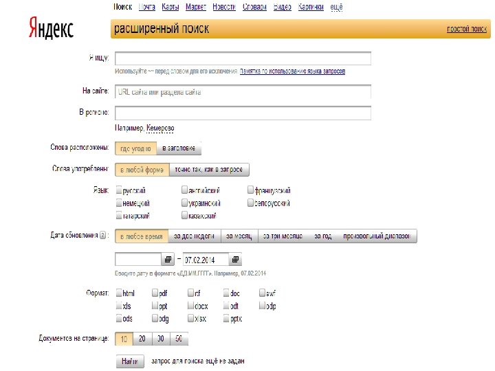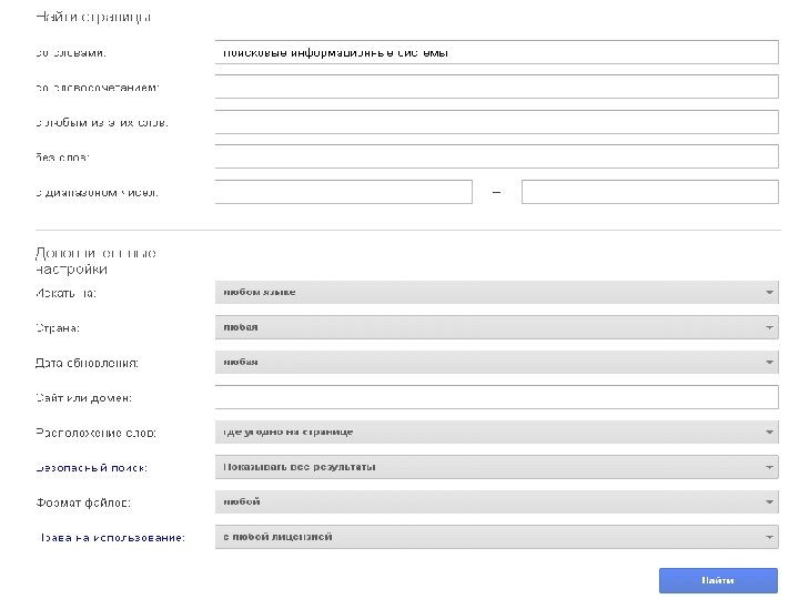 Расширенный поиск Многие современные ПС с целью повышения эффективности поиска позволяют вместо простого поиска производить т. н. «расширенный» . Он доступен по ссылке на странице поиска и представляет собой форму, которую нужно заполнить, ответив на дополнительные вопросы.