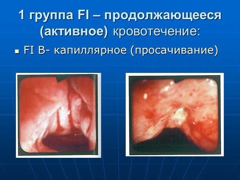 Оценка эндоскопической картины (классификация активности кровотечения Forrest J.A.H. в модификации В.И. Никишаева) 1 группа FI – продолжающееся (активное) кровотечение: FI А- струйное