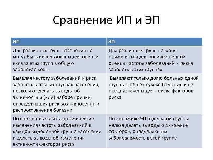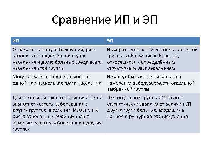 Сравнение ИП и ЭП ИП ЭП Для различных групп населения не могут быть использованы для оценки вклада этих групп в общую заболеваемость Для различных групп не могут применяться для количественной оценки частоты заболеваний и риска заболеть в этих группах Выявляя частоту заболеваний и риск заболеть в разных группах населения, позволяют делать выводы об активности и (или) наборе причин, определяющих риск возникновения и распространения болезни Выявляют только долю больных одной группы в общей сумме больных и не предназначены для поиска факторов риска Позволяют выявлять динамические изменения частоты заболеваний в каждой выделенной группе населения и делать выводы об изменении активности факторов риска По динамике ЭП отдельной группы нельзя делать выводы о динамике факторов, определяющих заболеваемость в этой группе