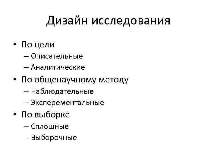 Дизайн исследования • По цели – Описательные – Аналитические • По общенаучному методу – Наблюдательные – Эксперементальные • По выборке – Сплошные – Выборочные