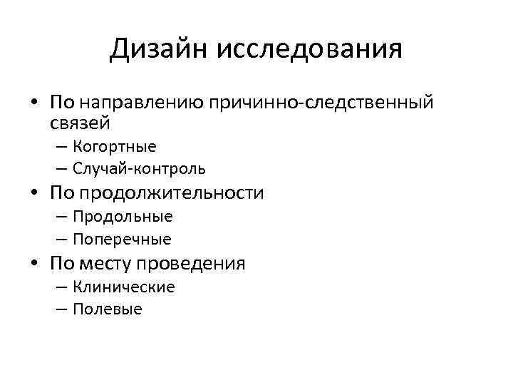 Дизайн исследования • По направлению причинно-следственный связей – Когортные – Случай-контроль • По продолжительности – Продольные – Поперечные • По месту проведения – Клинические – Полевые