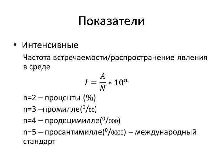 Показатели • Интенсивные – Инцидентность (Заболеваемость) Риск заболеть – Превалентность (Распространённость) • Точка превалентности • Период превалентности Риск быть больным