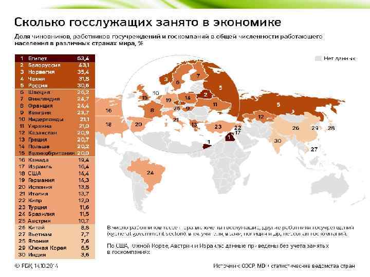 • Дефицит на рынке рабочей силы Сегодня в экспертном сообществе достаточно распространено представление о том, что в России существует острый дефицит рабочих рук. Однако из рынка рабочей силы изъяты следующие категории: ‐Полиция ( в три раза больше полицейских , чем в США) ‐Бюрократы (По данным Росстата, численность госслужащих или чиновников в России в 2013 году составила 1 млн 455 тыс. человек. , в 2014 г. 2 млн. 212 тыс. Владимир Путин подписал указ о сокращении с 1 января 2016 года штатной численности чиновников российских государственных ведомств на 10%. В России приходится 102 чиновника на 10 тыс. человек. Средняя зарплата 109, 1 тыс. руб. – в федеральных гос. органах) ‐ Армия (ежегодно около 300 тыс. молодых людей оказываются за пределами рынка труда). ‐ 940 тыс. священнослужителей