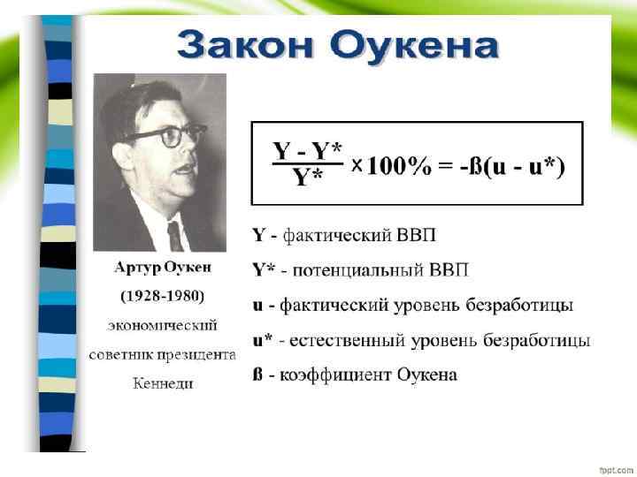 Более высокие темпы роста ВВП ведут к сокращению безработицы, а низкие темпы ‐ к её повышению ß – коэффициент Оукена, показывающий на сколько % сокращается фактический ВВП , если фактический уровень безработицы увеличивается на 1%. Так, превышение фактическим уровнем безработицы на 1% ее естественного уровня приводит к отставанию объема фактического ВВП от потенциального (при полной занятости) ВВП - на 2, 5% (коэффициент Оукена).