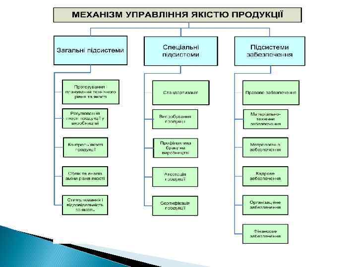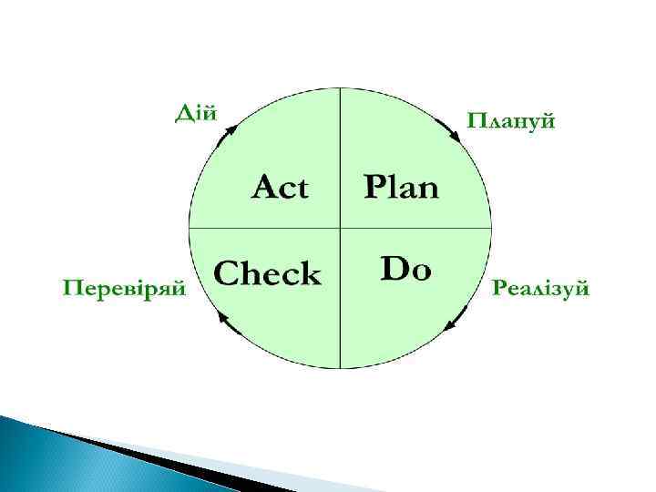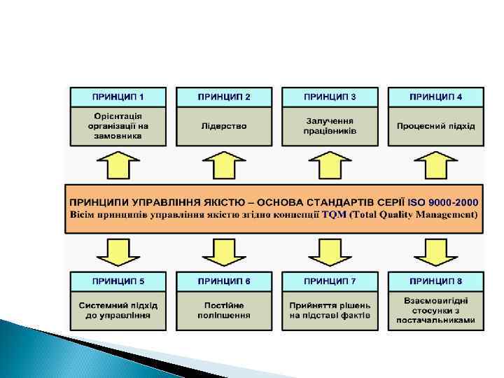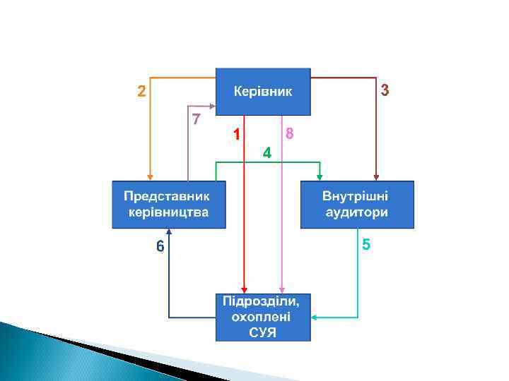 1. Прийняття рішення та впровадження СУЯ на підприємстві (вимоги) 2. Призначення представника керівництва, уповноваженого з СУЯ (Відповідальність, повноваження) 3. Призначення внутрішніх аудиторів (наділення владою) 4. Програма аудитів, плани конкретних аудитів 5. Проведення аудитів (внутрішніх перевірок якості) 6. Результати перевірок, отримані аудиторами 7. Звіти по ефективності СУЯ, матеріали для аналізу керівництва 8. Дії щодо поліпшення системи
