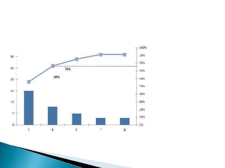 Види діаграм Паретто: – за результатами діяльності - призначена для виявлення головної проблеми небажаних результатів діяльності; – за причинами - використовується для виявлення головної причини проблем, що виникають в ході виробництва. Особливість методу: 20% зусиль дають 80% результату, а інші 80% зусиль - лише 20% результату.