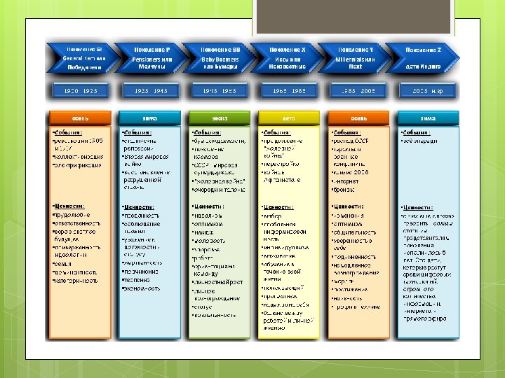 Критерии Поколение Х Поколение Y Поколение Z Образ Дети с ключом на шее Поколение сети, поколение Путина, поколение большого пальца Поколение «Папиных дочек» Годы рождения 1964 -1984 1985 -2000 -2020 Психологические характеристики Умение жить в условиях изменений, мобильность, прагматизм. Важны: семья, дети, близкие Уход в виртуальность, лояльность и виртуальность ко всему, наивность, индивидуализм, умение «играть по правилам» Техническая грамотность, творчество, клиповое сознание, постоянный поиск «красочной картинки» . Свободные личности, но в виртуальной реальности.