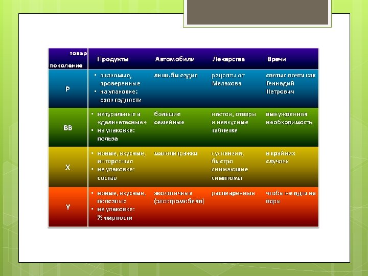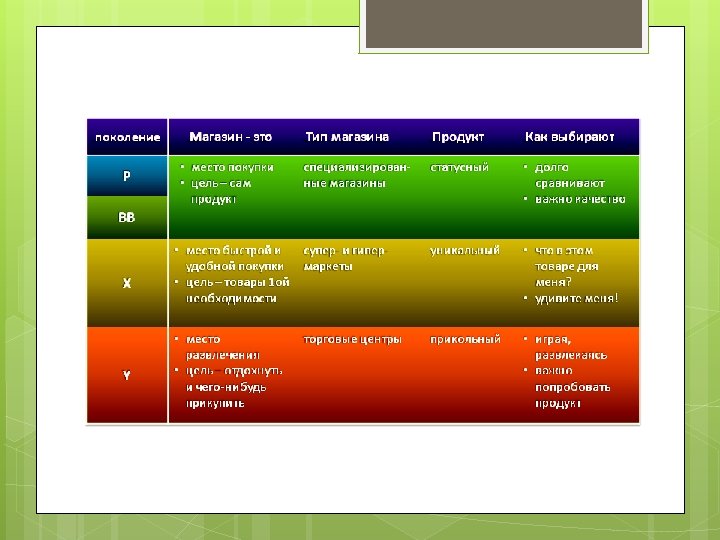 Критерии Поколение Х Поколение Y Поколение Z Типичное поведение в любви Пострадать, поговорить, попереживать вслух, в поисках настоящей любви Все люди разные, надо легко принимать и двигаться дальше Скорее…идеализ ация партнера, романтизм, смешивание виртуального и реального Типичное поведение в магазине (обсчитали) Громкое возмущение, Книга жалоб. Ну что же, так бывает, больше сюда не придет, а как правило ходят компаниями, значит не придут все Конфликтов в автоматизирован ной и виртуальной сфере услуг скорее всего не будет