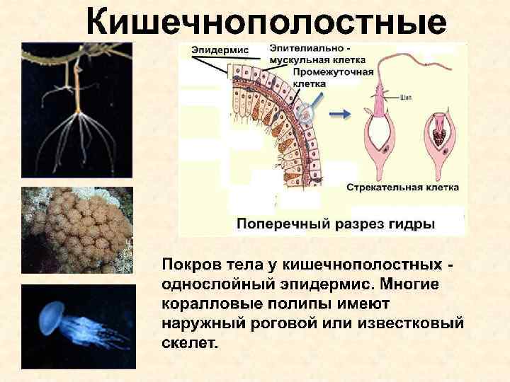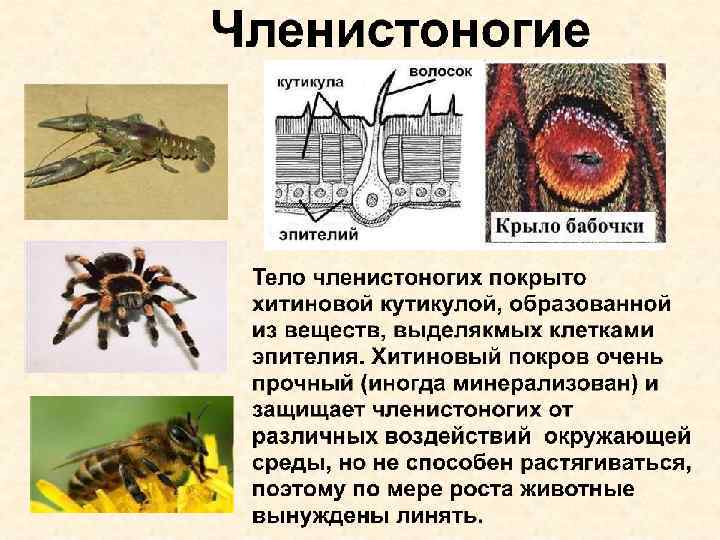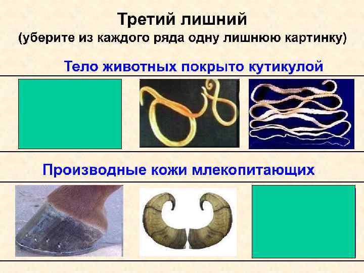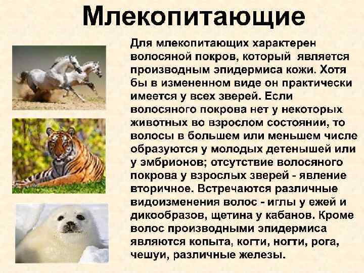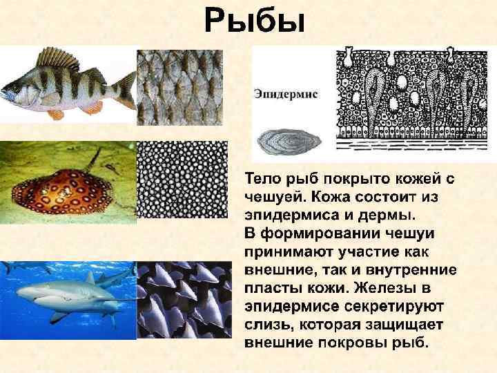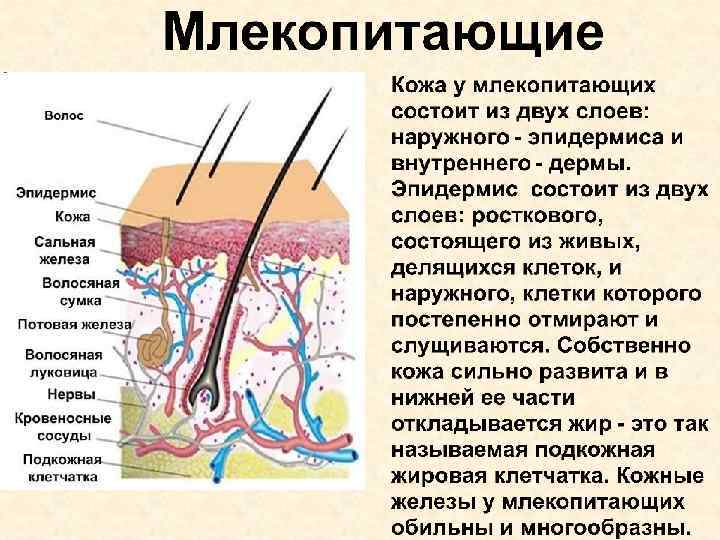 Систематическое положение животного Строение покровов тела Тип Кишечнополостные Наружная клеточная мембрана у организмов с постоянной формой тела Эктодерма Тип Плоские черви Плоский эпителий Тип Круглые черви Плоский эпителий Тип Кольчатые черви Плоский эпителий Тип Простейшие Тип Моллюски Тип Членистоногие Класс Ланцетники Кутикула (с известью) Покровная ткань, сверху кутикула с хитином. У ракообразных кутикула пропитывается известью Тип Хордовые Кожа Класс Рыбы Кожа, костные чешуи, слизистые железы Класс Земноводные Кожа, слизистые железы Класс Пресмыкающиеся Кожа (сухая), роговые чешуи Класс Птицы Кожа (сухая), роговые перья Кожа, потовые, сальные, млечные железы. Волосяной покров (роговое вещество) Класс Млекопитающие