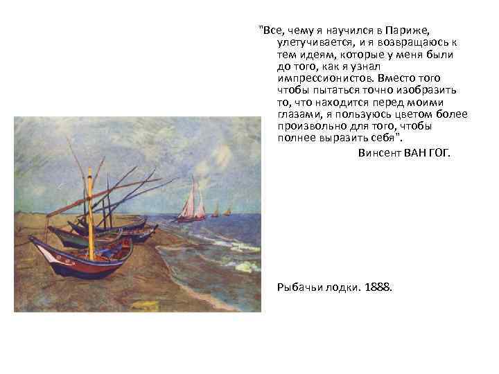 "Все, чему я научился в Париже, улетучивается, и я возвращаюсь к тем идеям, которые у меня были до того, как я узнал импрессионистов. Вместо того чтобы пытаться точно изобразить то, что находится перед моими глазами, я пользуюсь цветом более произвольно для того, чтобы полнее выразить себя". Винсент ВАН ГОГ. Рыбачьи лодки. 1888.