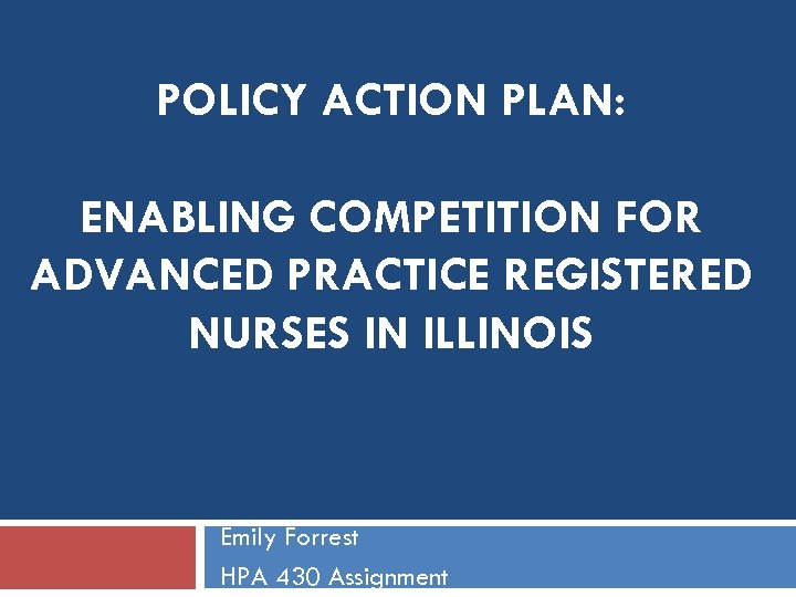 POLICY ACTION PLAN: ENABLING COMPETITION FOR ADVANCED PRACTICE REGISTERED NURSES IN ILLINOIS Emily Forrest HPA 430 Assignment