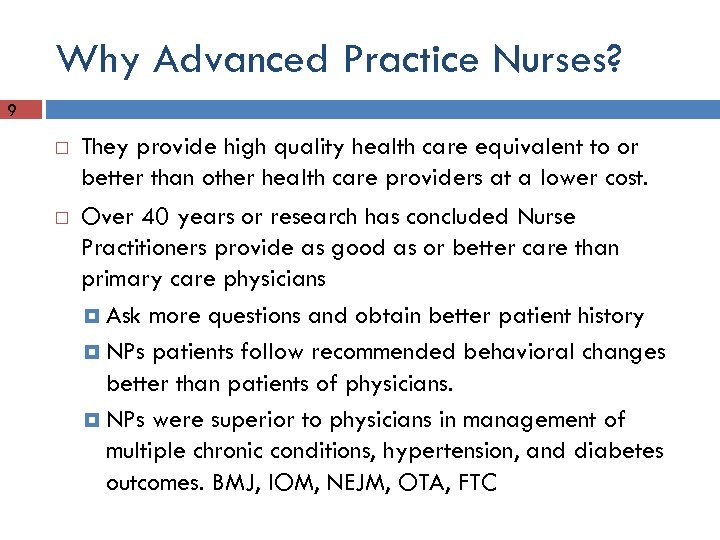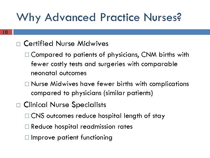 Why Advanced Practice Nurses? 9 They provide high quality health care equivalent to or better than other health care providers at a lower cost. Over 40 years or research has concluded Nurse Practitioners provide as good as or better care than primary care physicians Ask more questions and obtain better patient history NPs patients follow recommended behavioral changes better than patients of physicians. NPs were superior to physicians in management of multiple chronic conditions, hypertension, and diabetes outcomes. BMJ, IOM, NEJM, OTA, FTC