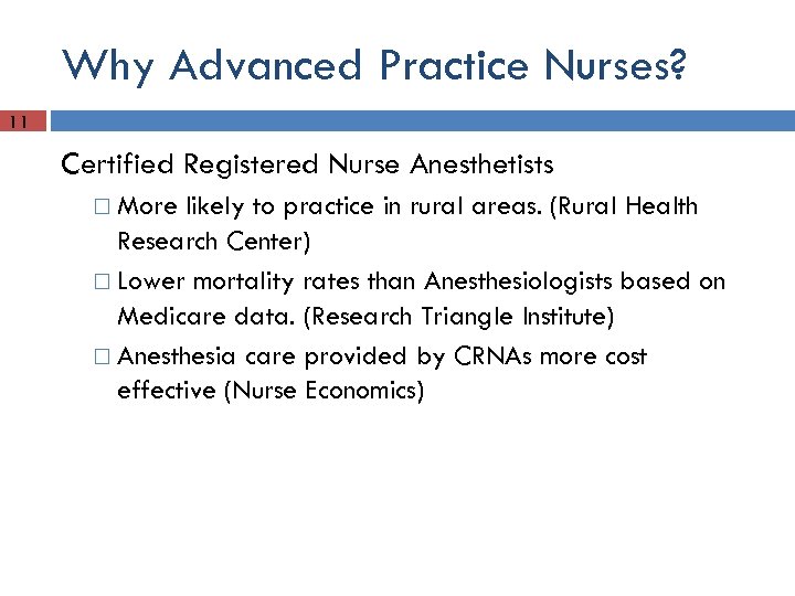 Why Advanced Practice Nurses? 10 Certified Nurse Midwives Compared to patients of physicians, CNM births with fewer costly tests and surgeries with comparable neonatal outcomes Nurse Midwives have fewer births with complications compared to physicians (similar patients) Clinical Nurse Specialists CNS outcomes reduce hospital length of stay Reduce hospital readmission rates Improve patient functioning