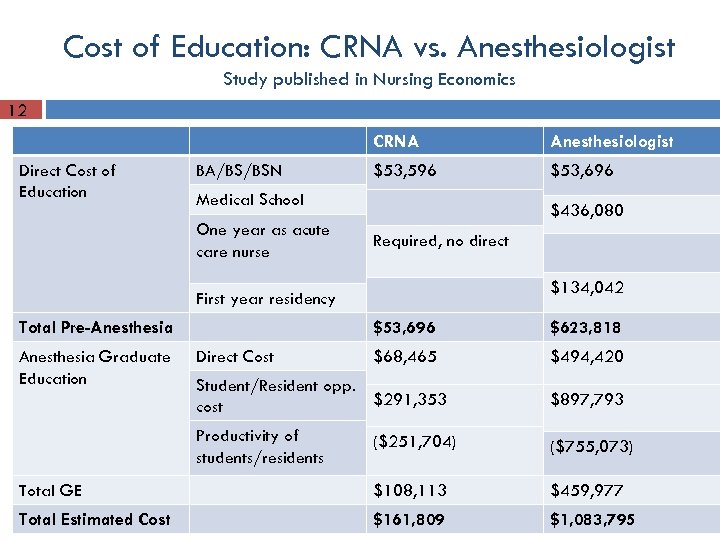 Cost of Education: CRNA vs. Anesthesiologist Study published in Nursing Economics 12 CRNA Direct Cost of Education BA/BS/BSN Anesthesiologist $53, 596 $53, 696 Medical School One year as acute care nurse $436, 080 Required, no direct $134, 042 First year residency Total Pre-Anesthesia Graduate Education $53, 696 Direct Cost $623, 818 $68, 465 $494, 420 Student/Resident opp. $291, 353 cost $897, 793 Productivity of students/residents ($251, 704) ($755, 073) Total GE $108, 113 $459, 977 Total Estimated Cost $161, 809 $1, 083, 795