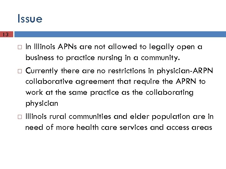 Issue 13 In Illinois APNs are not allowed to legally open a business to practice nursing in a community. Currently there are no restrictions in physician-ARPN collaborative agreement that require the APRN to work at the same practice as the collaborating physician Illinois rural communities and elder population are in need of more health care services and access areas